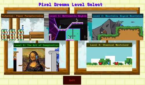 Pixel Dreams is a platformer game that takes players on a journey through various college classthemed levels each with unique enemies, platforms, and player weapons with the goal of scoring enough pointsto make it to the finish line. All our developers worked hard to make sure that all components ranging from enemies, weapons, physics interactions, and environments were up to par. The game is still undergoing further development, but upon completion, there are plans to upload the code to itch.io with HTML5 compatibility so that everyone can see what just a few college students can do.